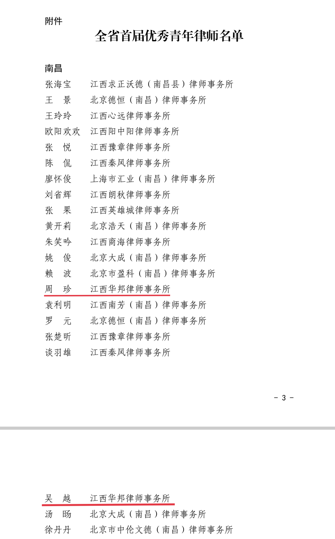 其中,我所高级合伙人周珍律师、合伙人吴越律师被评选为“全省首届优秀青年律师”,并被通报表扬。
