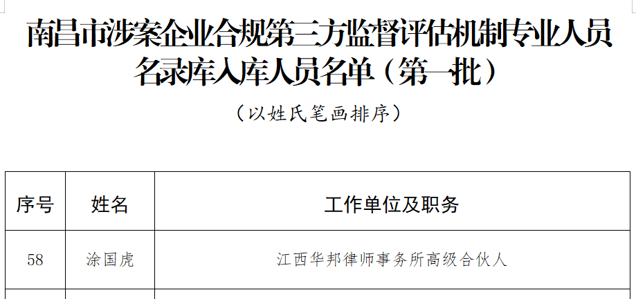 华邦荣誉 | 我所涂国虎律师成功入选南昌市首批涉案企业合规第三方监督评估机制专业人员名录库