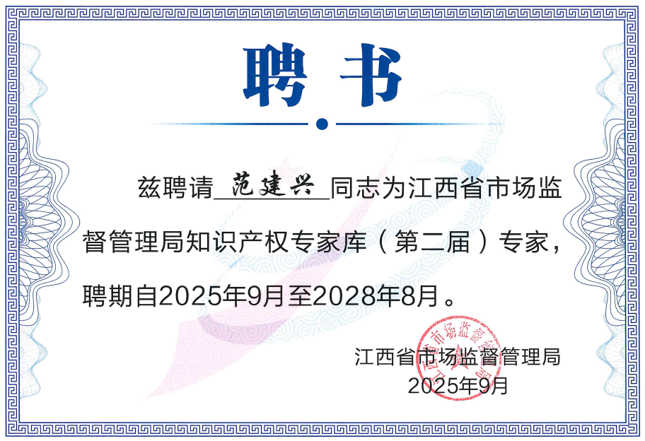 经集体审核和网上公示等程序,2025年9月2日,江西省市场监督管理局发布了《关于入选江西省市场监督管理局知识产权专家库(第二届)专家名单的公告》,我所高级合伙人范建兴律师受聘为江西省市场监督管理局知识产权专家库(第二届)专家,聘期自2025年9月起至2028年8月止。